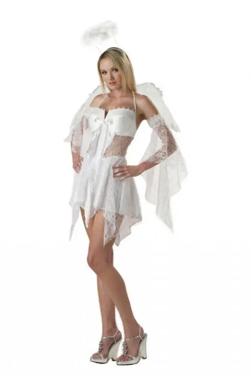 Heaven Sent!Includes: White lace and satin dress with detached sleeves andwings with attached halo.Available sizes: