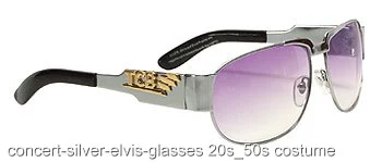 SunglassesCaseTop off our Elvis Presley or 50s costume with these concert silver Elvis glasses. They have a thin, silver frame around the lens that becomes thicker across the nose. The sides are thick and decorated with the brand name, TCB, in gold. The purple-tint lens are large and round. Stand out above all other Elvis Presley costumes when you complement yours with these concert silver Elvis glasses!