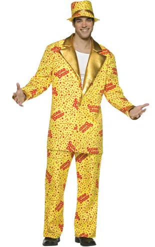 Two piece suit covered with Sugar Daddy logo with gold collar and matching hat.