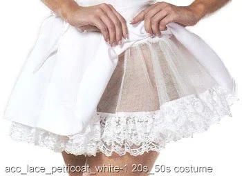 White Lace Petticoat:White crinoline petticoat has 3 inches of lace trim along the bottom and an elastic waist.One size fits most adult women’s sizes.This one size fits all White Lace Petticoat is perfect if you’re looking to add a bit of sex appeal to your costume. The accessory has a crinoline body with a 3″ white lace decorative trim on the bottom. You will be sure to catch gazes at any party with the help of this Lace Petticoat.